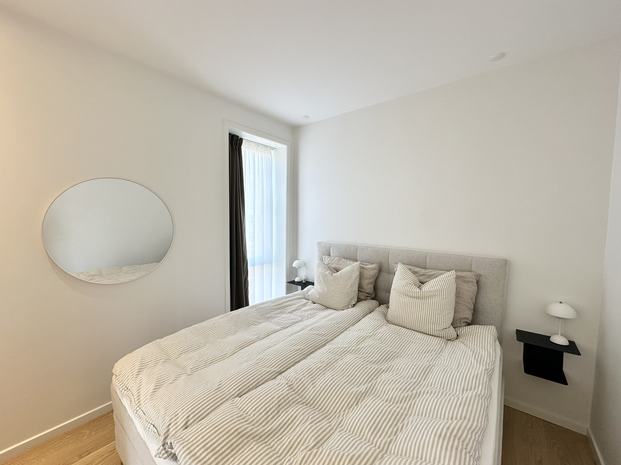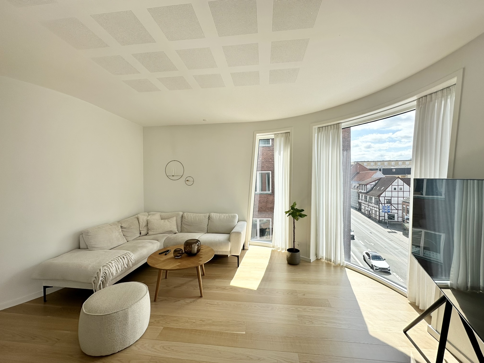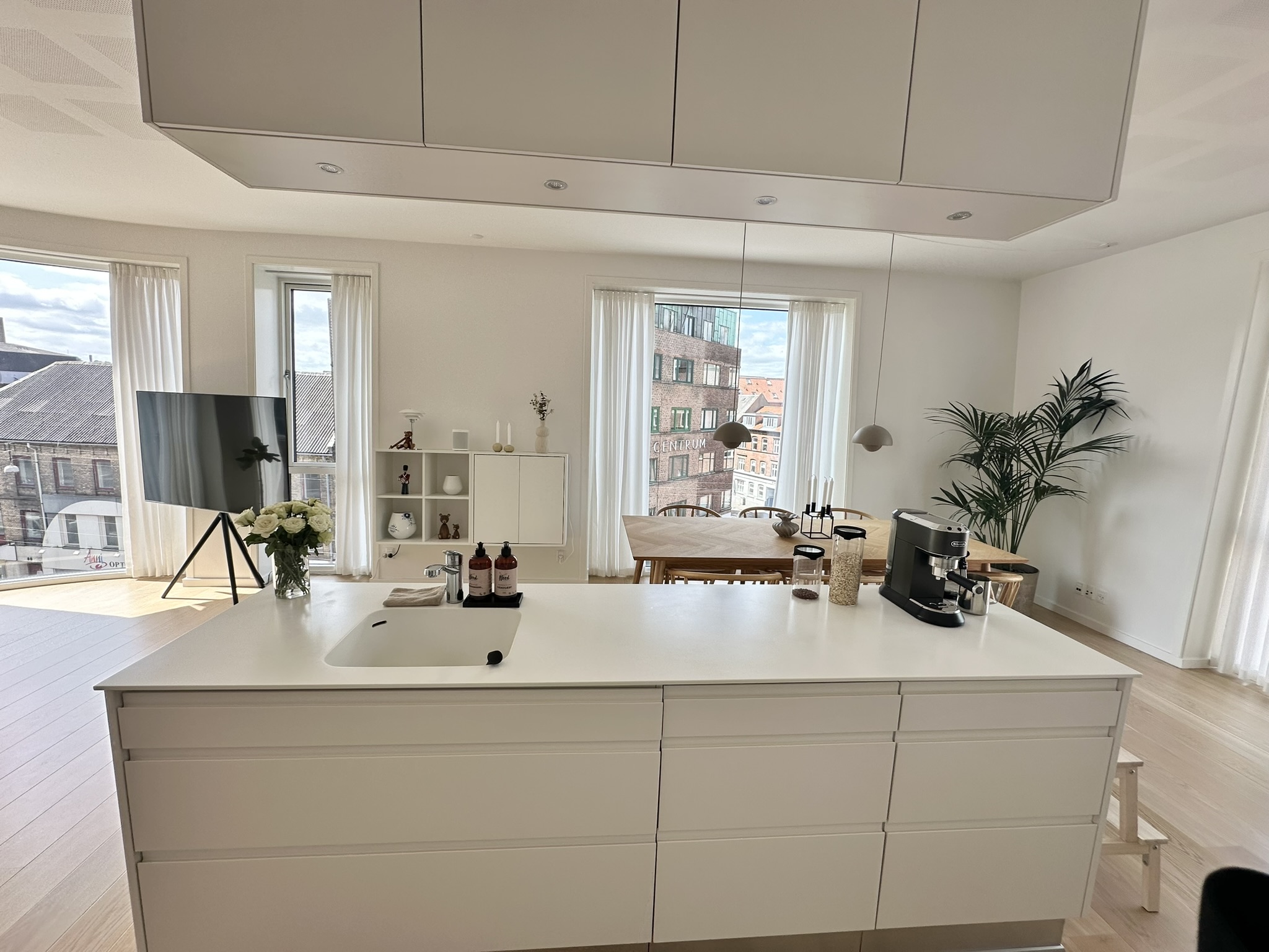 Når du træder ind i lejligheden, bliver du mødt af et fantastisk lysindfald, der strømmer ind gennem de store vinduespartier og skaber en lys og åben stemning. Stuen og køkken-alrummet er samlet i ét, hvilket skaber et moderne og socialt opholdsrum med en skøn udsigt over byen. Lejligheden rummer et dejligt soveværelse med god skabsplads samt et stilrent badeværelse med flotte klinker og moderne løsninger. Overalt i boligen er der valgt kvalitetsmaterialer, herunder smukke egetræsparketgulve og elegante køkkenelementer med corianbordplade, samt gulvvarme i hele lejligheden.
