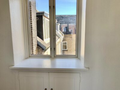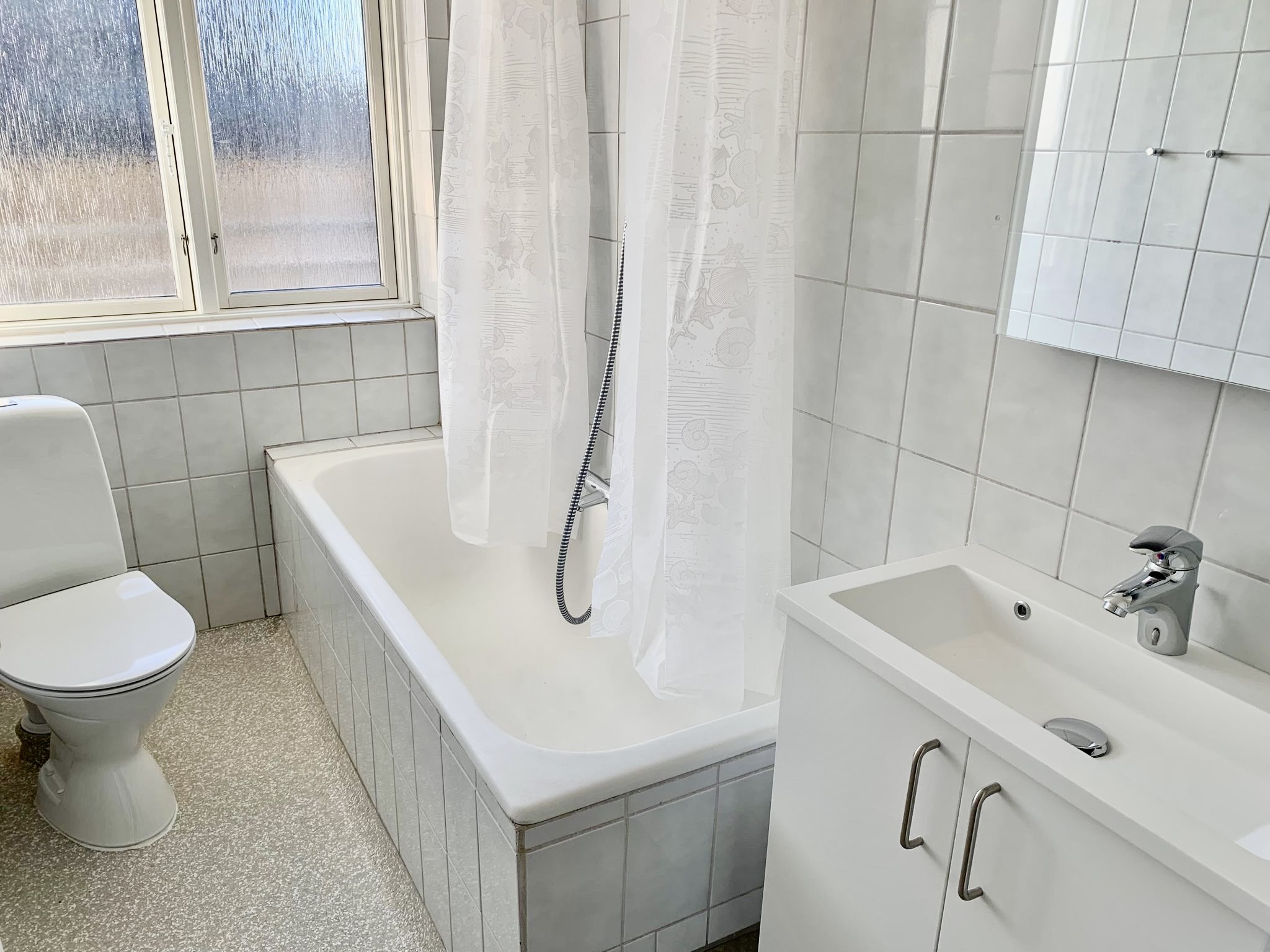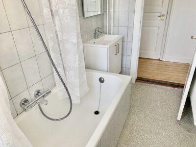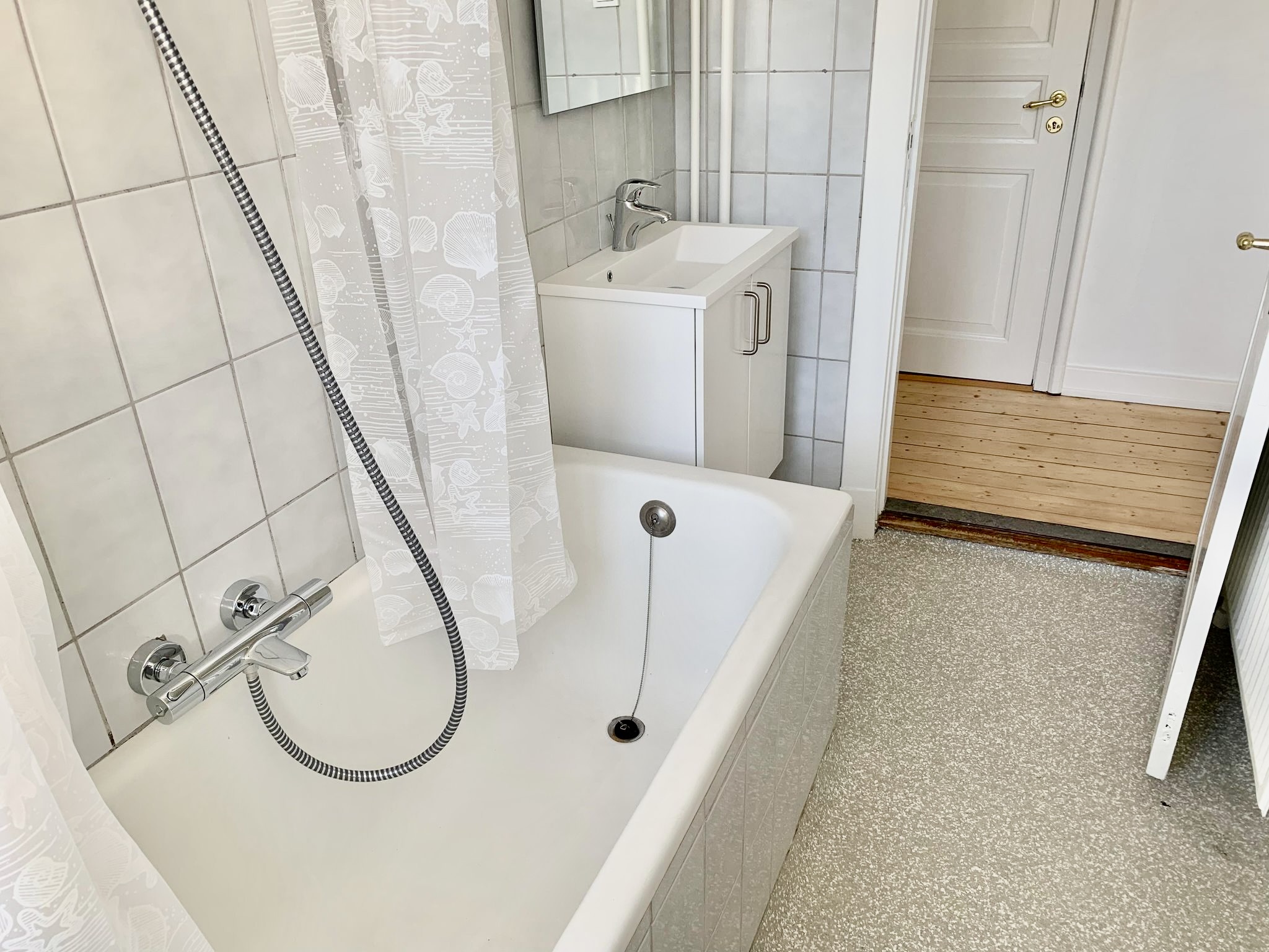I gangen har vi en vindueskarm, der lige pynter lidt ned ad den ellers tomme gang. Til venstre har vi badeværelset. Her er et badekar, som er yderst sjældent i dag. Der er selvfølgelig gjort, så det også kan benyttes til almindelig brusekabine.