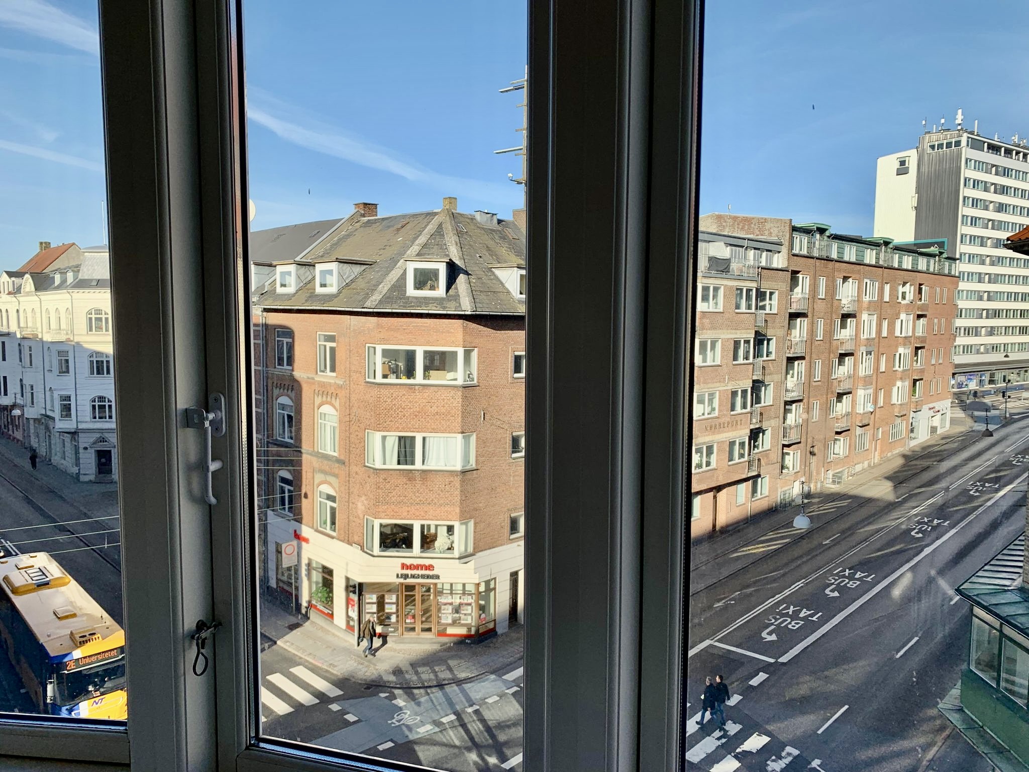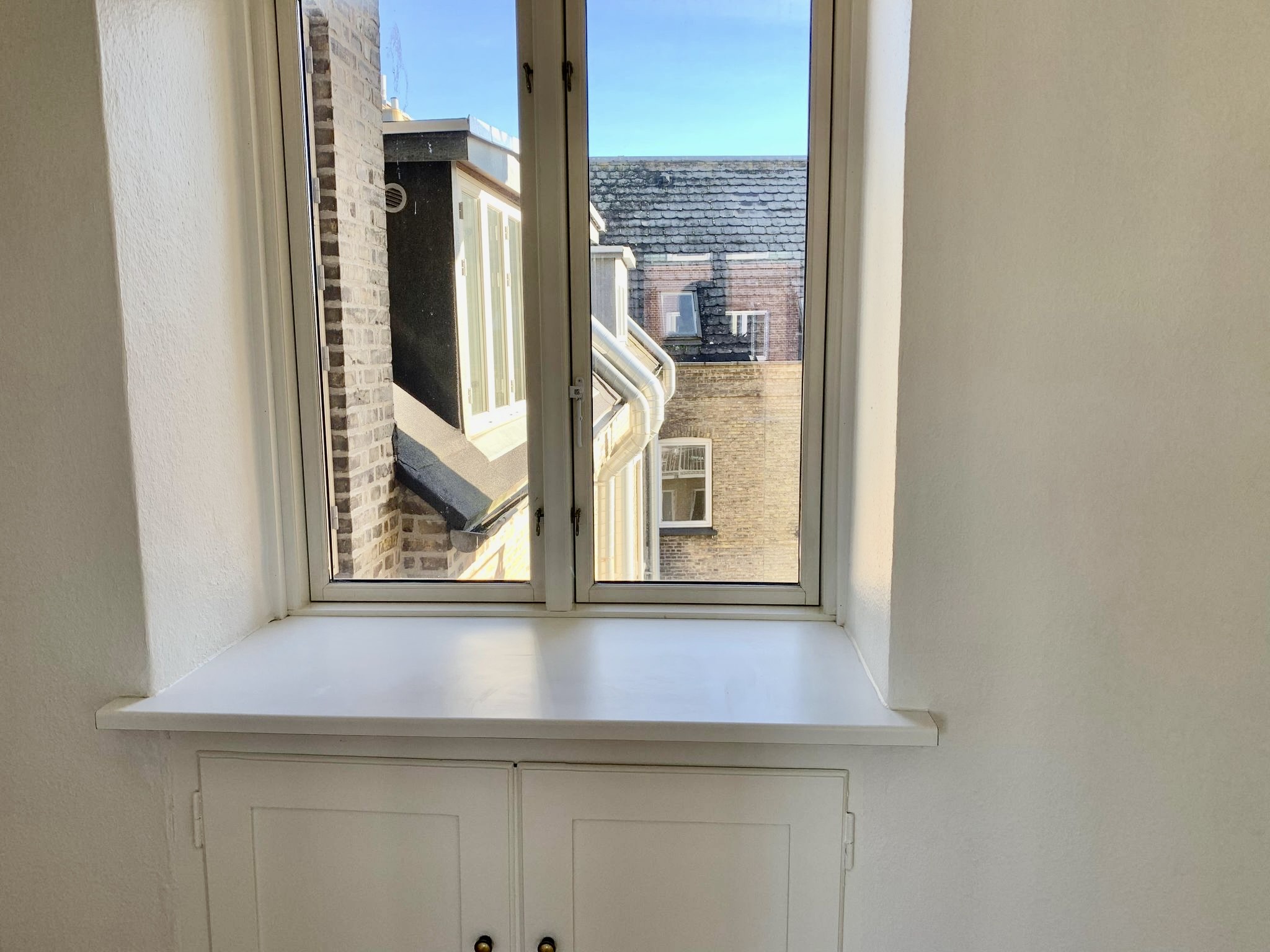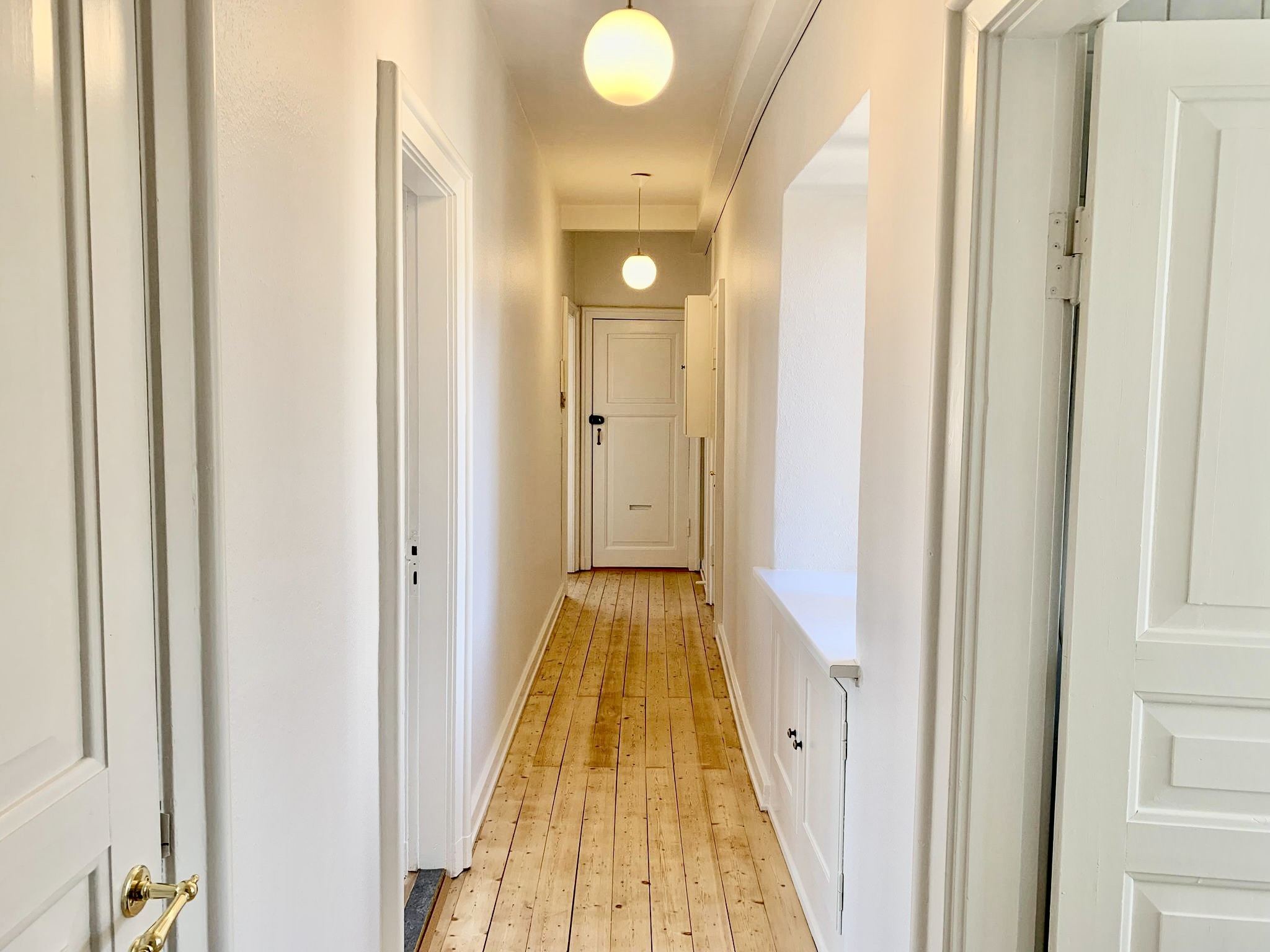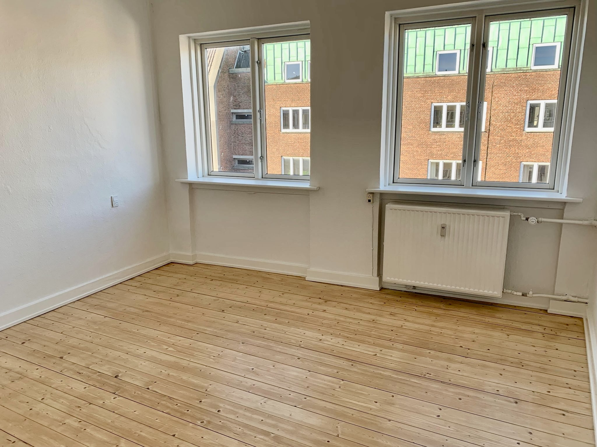 Når du træder ind i lejligheden kommer du ind i en lang fordelingsgang, der fører ind til alle værelserne. Først har vi til højre et stort værelse med et fantastisk flot vinduesparti. Der lyser værelset op, og udsigten er til Vesterbro, hvor der er en masse at se på.