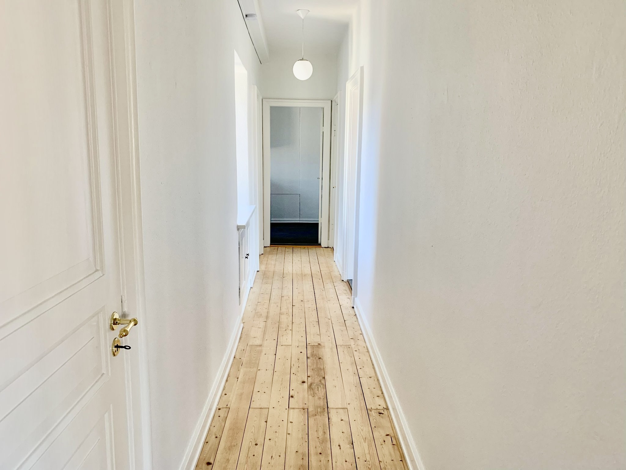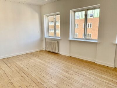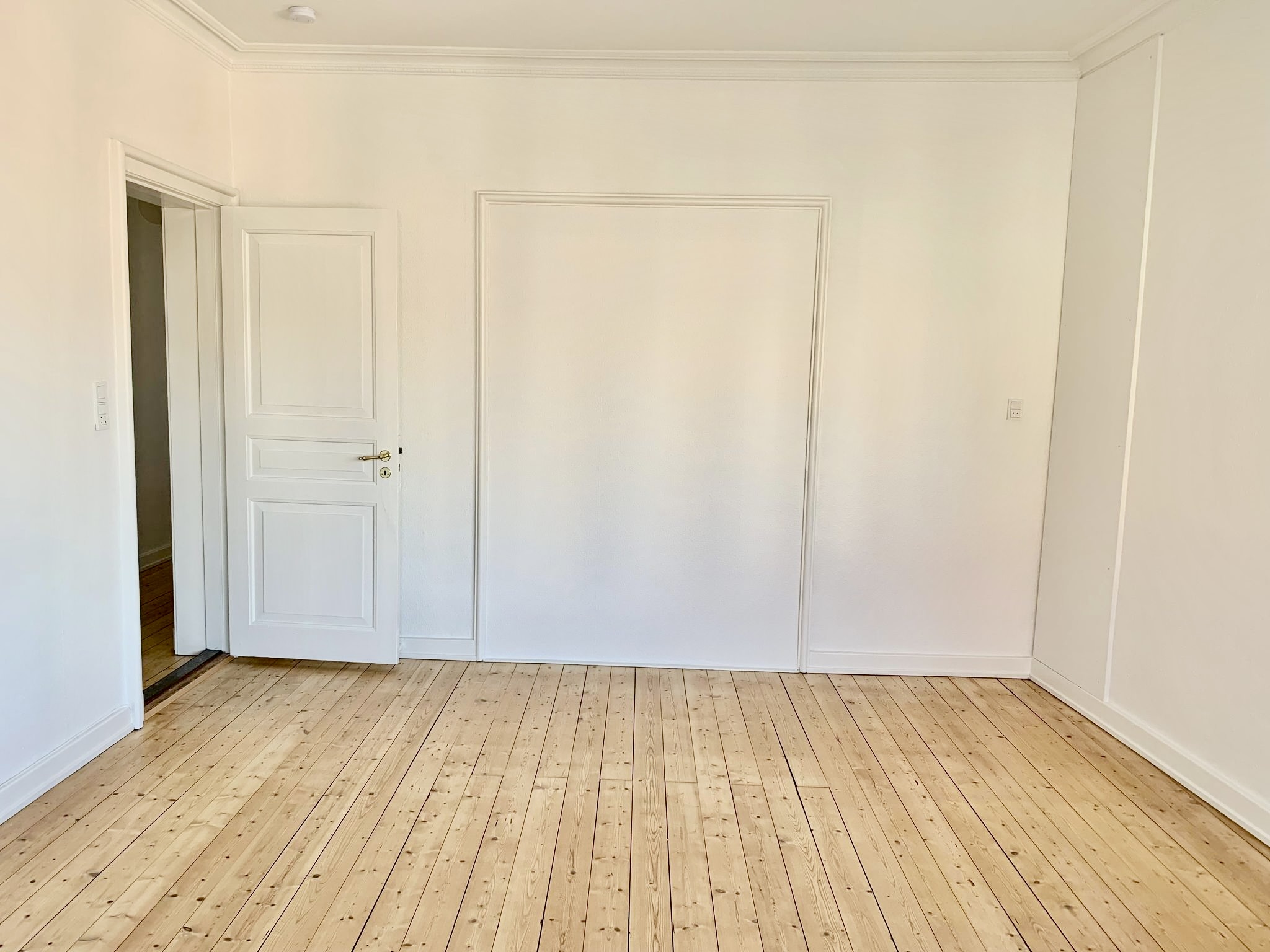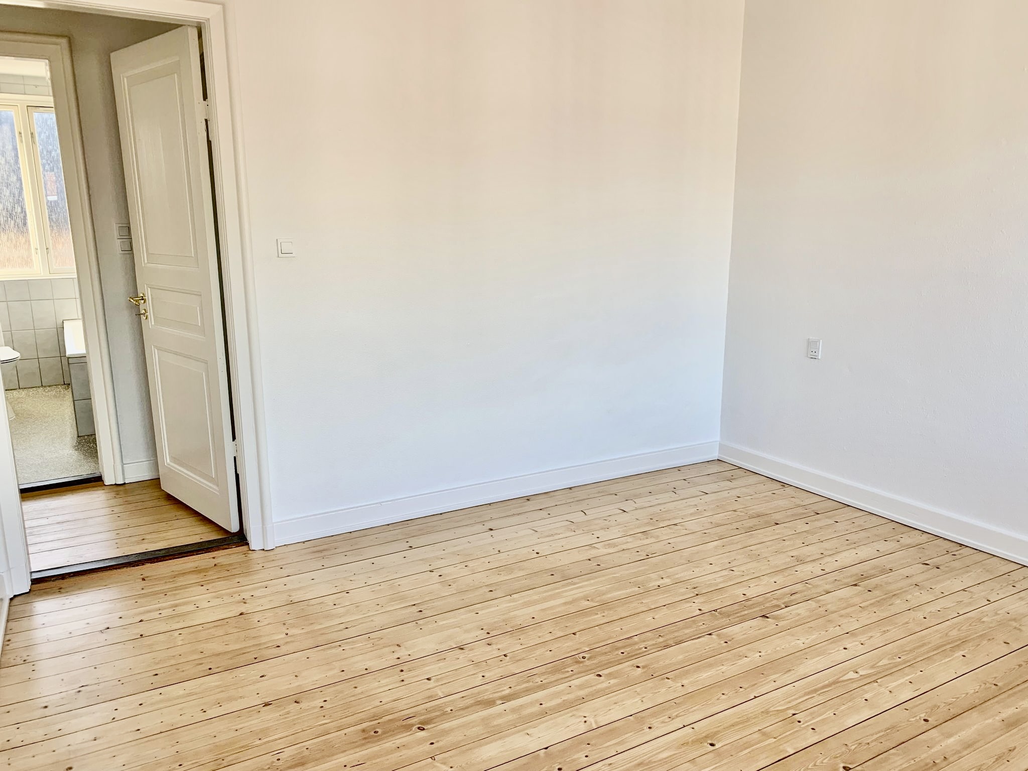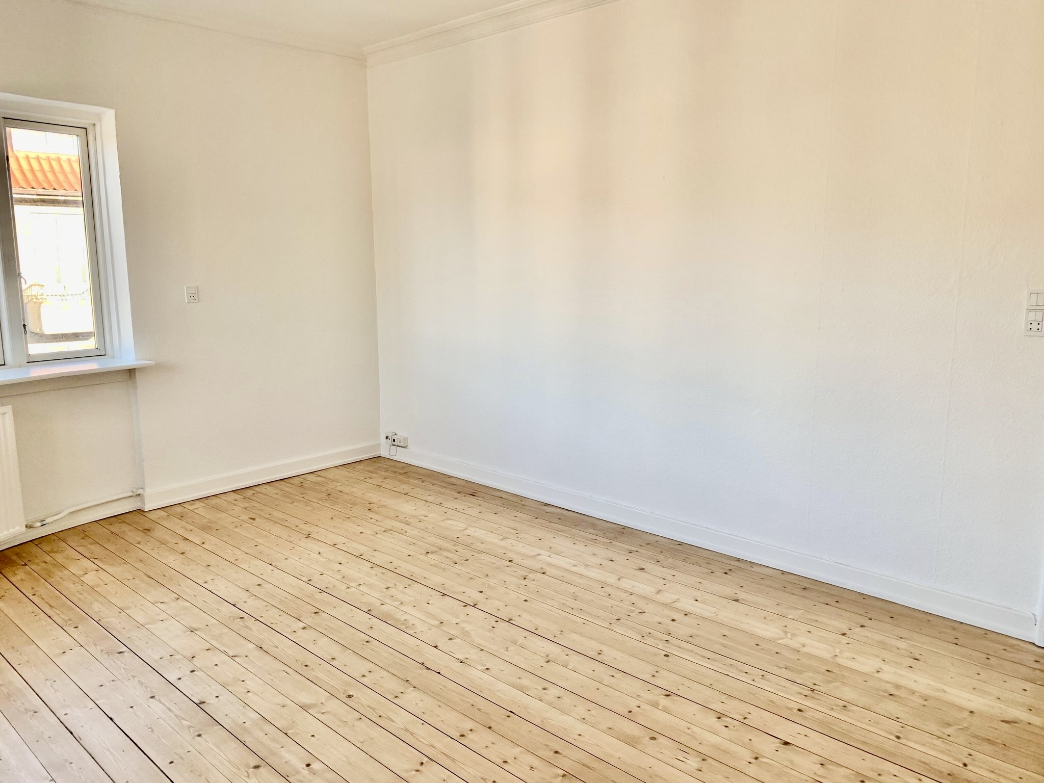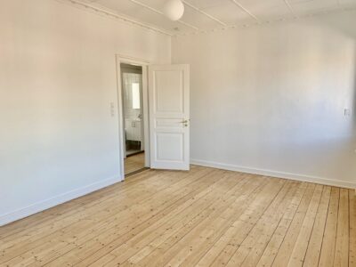 Ud på fordelingsgangen igen kan du fortsætte hele vejen ned, hvor er der værelser på højre side. Næste rum er det største vil egne sig godt som lejlighedens stue. Der er ingen klædeskabe i lejligheden, så man kan helst selv bestemme hvilket rum, der skal fungerer som hvad. I stuen kan man i den ene ende sagtens have spisebord og stue i den anden. Ellers kan det første rum sagtens bruges til stue. I dette rum er der også godt med lys fra vinduerne.