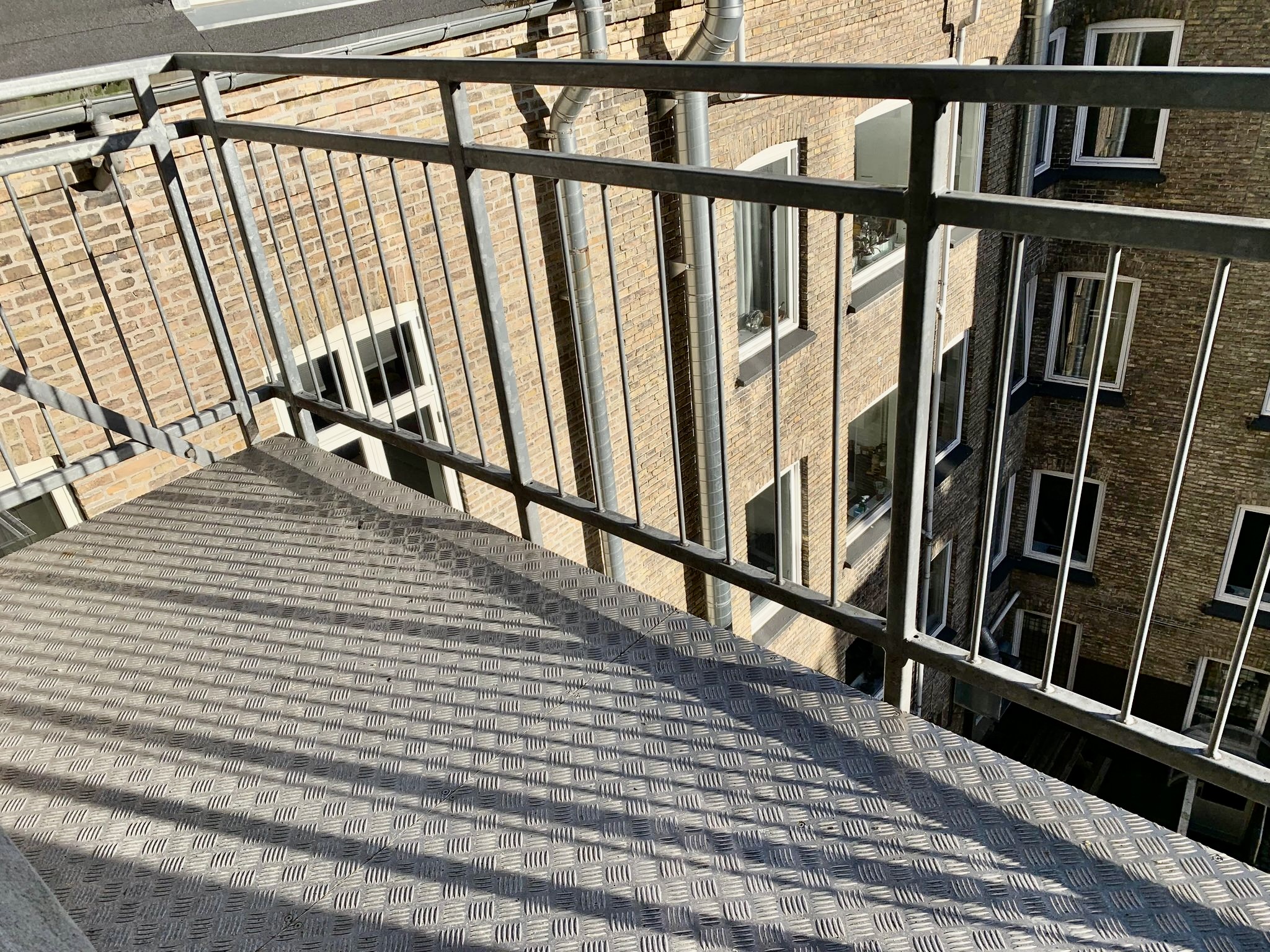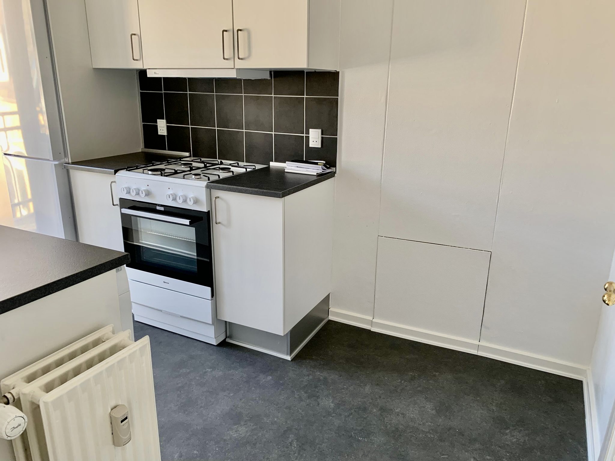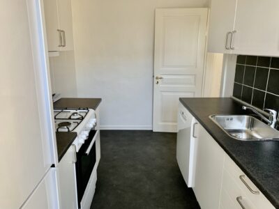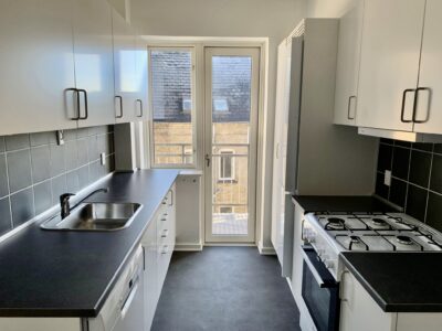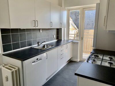 Til slut har vi køkkenet, som er med sort gulv og flotte nye materialer. Der er installeret en opvaskemaskine, og der er lidt ekstra plads til et mindre bord eller hvad man nu mangler derude. Fra køkkenet er der udgang til altanen, som er solrig om eftermiddagen.