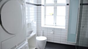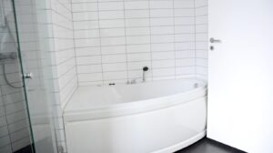 Det moderne badeværelse er nyligt renoveret med lækre fliser, spabad, bruseniche og egen vaskesøjle.