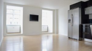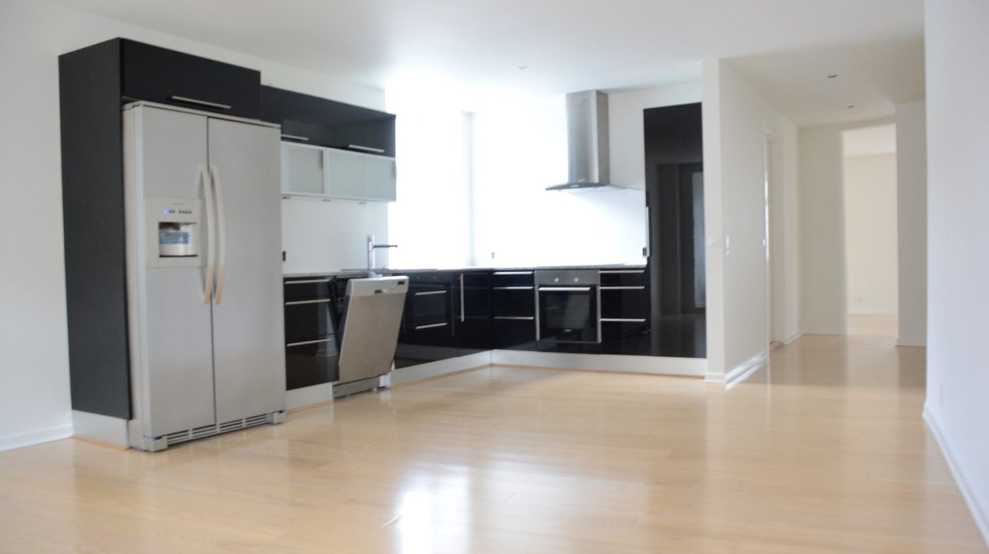 Køkken-alrummet er et sandt hjerte i lejligheden med et stilfuldt sort højglanskøkken, som er udstyret med alle nødvendige hårde hvidevarer, herunder et amerikansk køle-/fryseskab og opvaskemaskine. I køkkenet er der også opsat fladskærms-TV, og der er god plads til et stort spisebord – perfekt til samvær og middagsselskaber.
