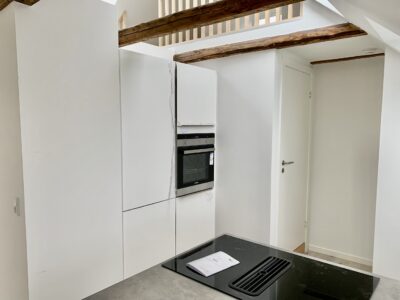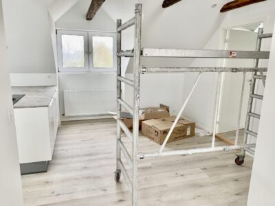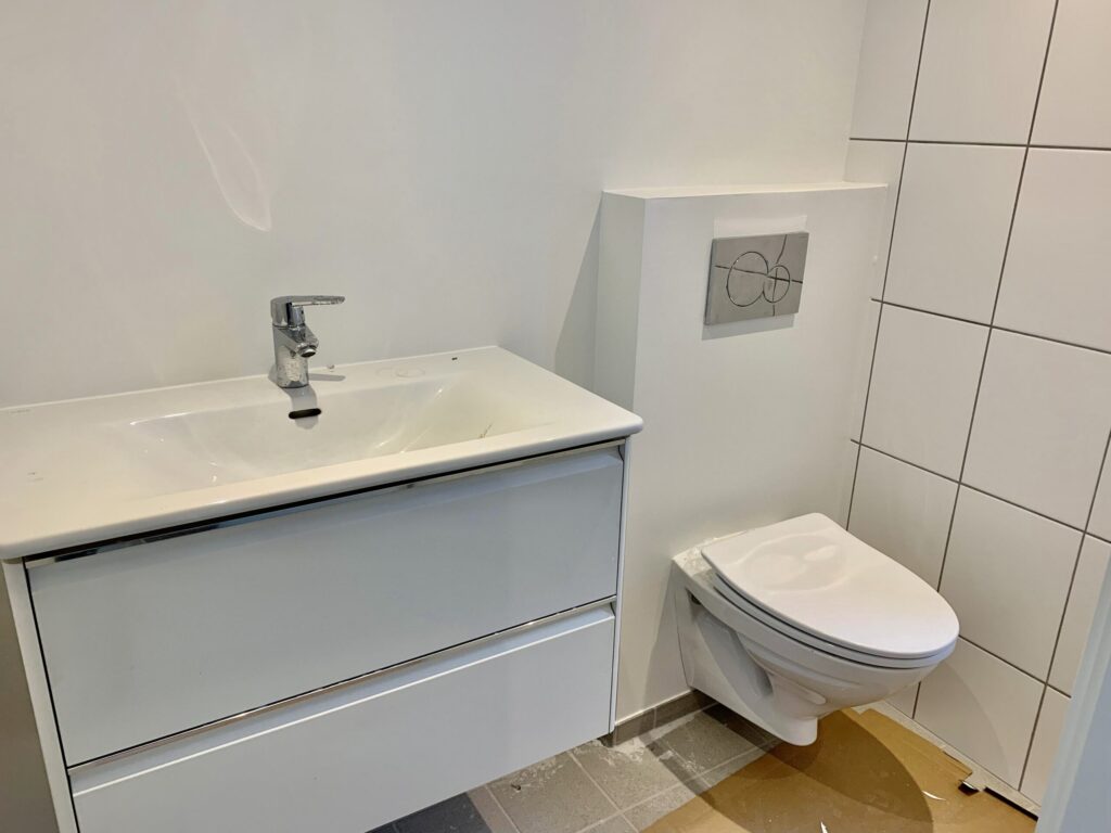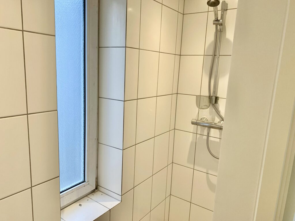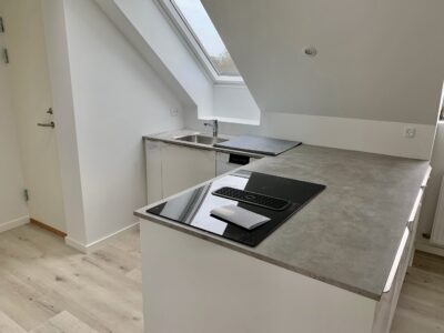 I forbindelse med stuen, men stadig ved en slags opdeling har vi køkken alrummet. Her er der plads til et spisebord, og så har man det super flotte nye køkken, der er indrettet rigtig godt. Fra køkkenet er der en lille krog, hvor der er indgang til et nyt lækkert badeværelse med indbygget brus.