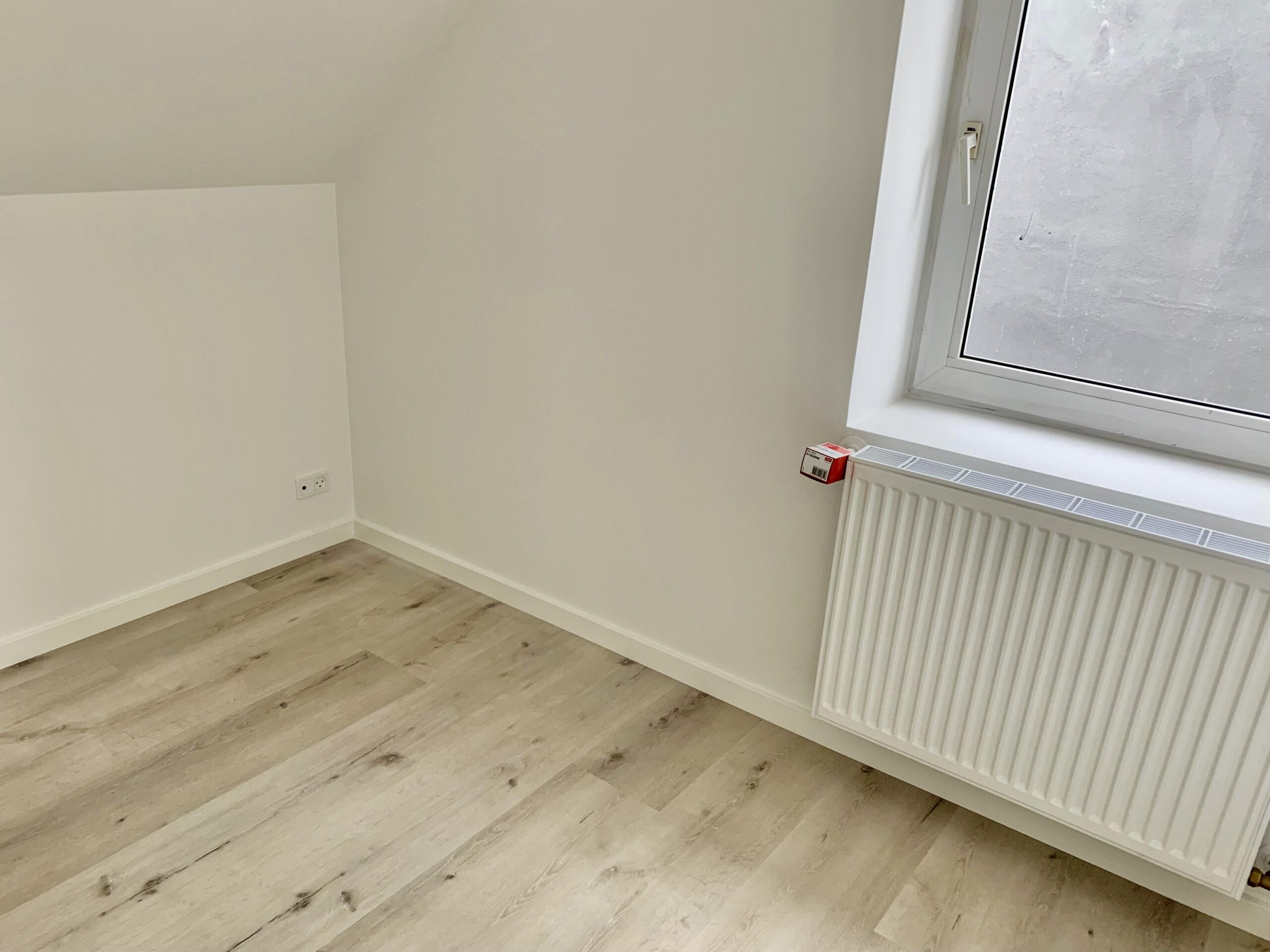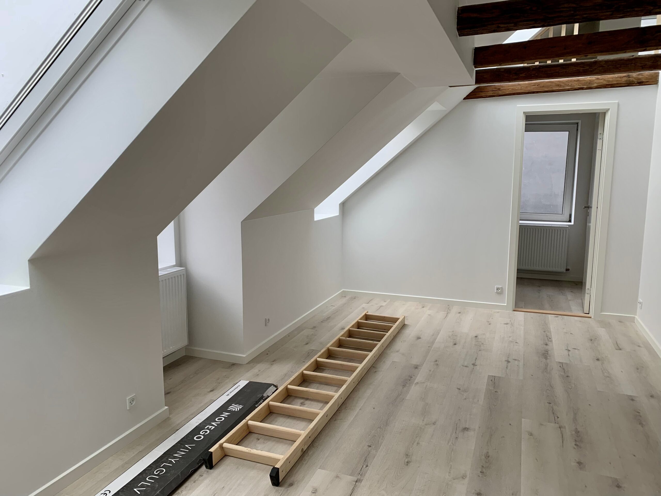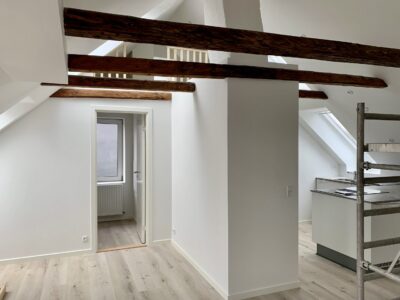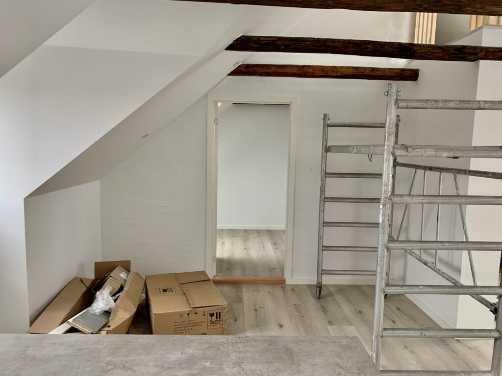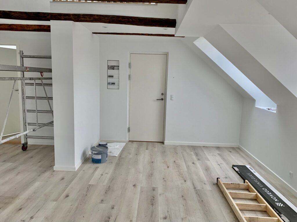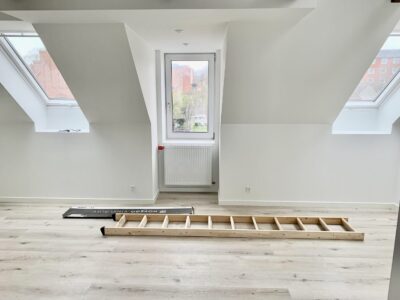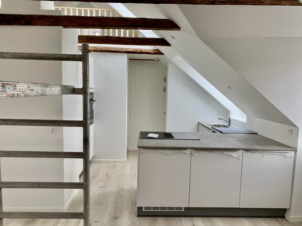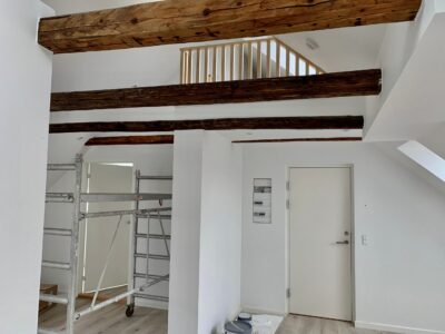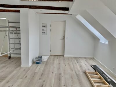 Lejligheden er bestående af en dejlig stue, hvor der er to stiger op til to forskellige hemse. Fra stuen er der indgang til et ekstra værelse, hvor man kan have et lille kontor eksempelvis. Lejligheden er lyst godt op af vinduerne, som er en af de dejlige ting ved en taglejlighed.