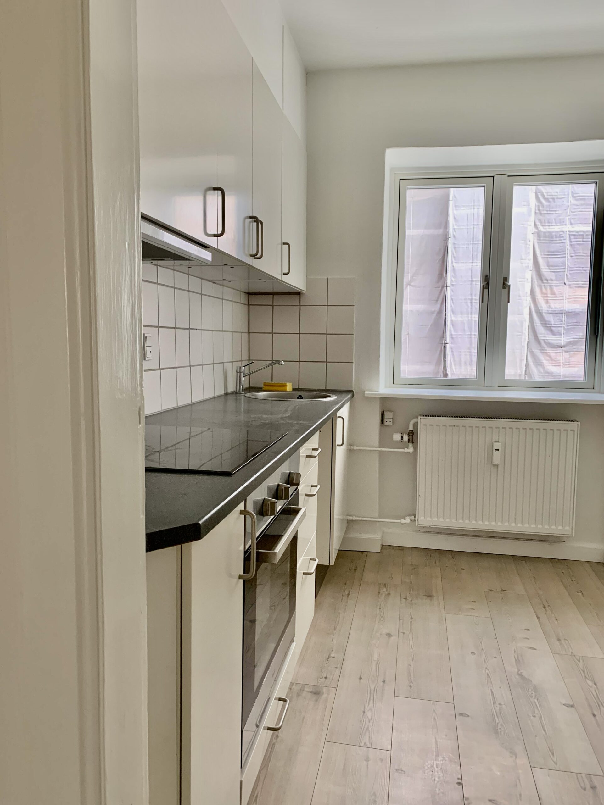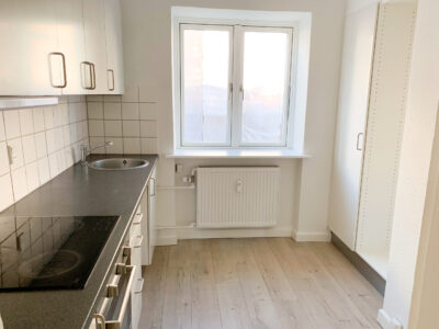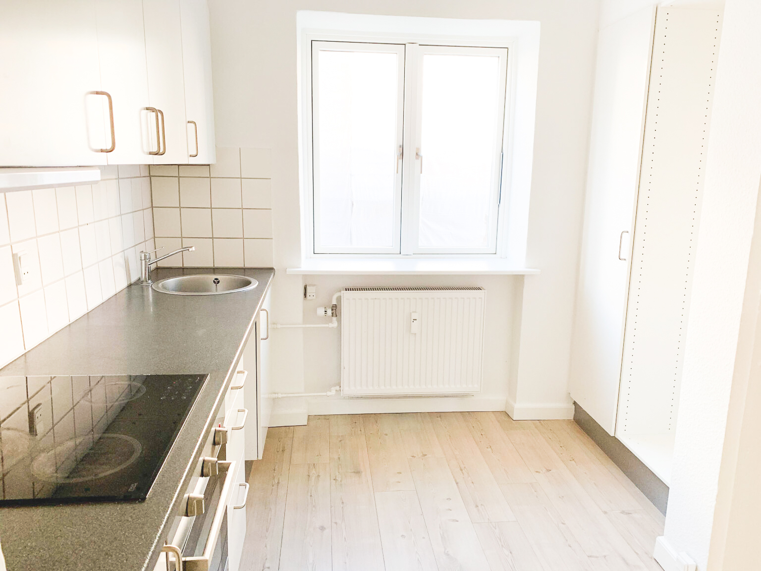 Køkkenet forener funktion og elegance med en smuk og moderne hvid nuance, der giver dig mulighed for at tilføje dit personlige præg. Der er også ekstra plads til at udfolde dine madlavningsfærdigheder og kreativitet. Denne lejlighed skaber en behagelig og rummelig atmosfære, der giver dig frihed til at forme hjemmet efter dine ønsker.