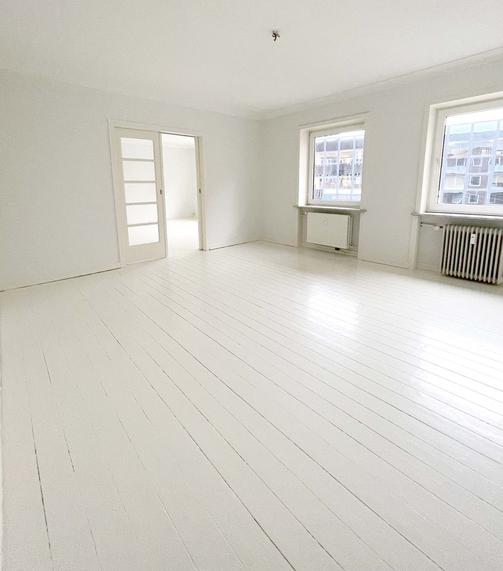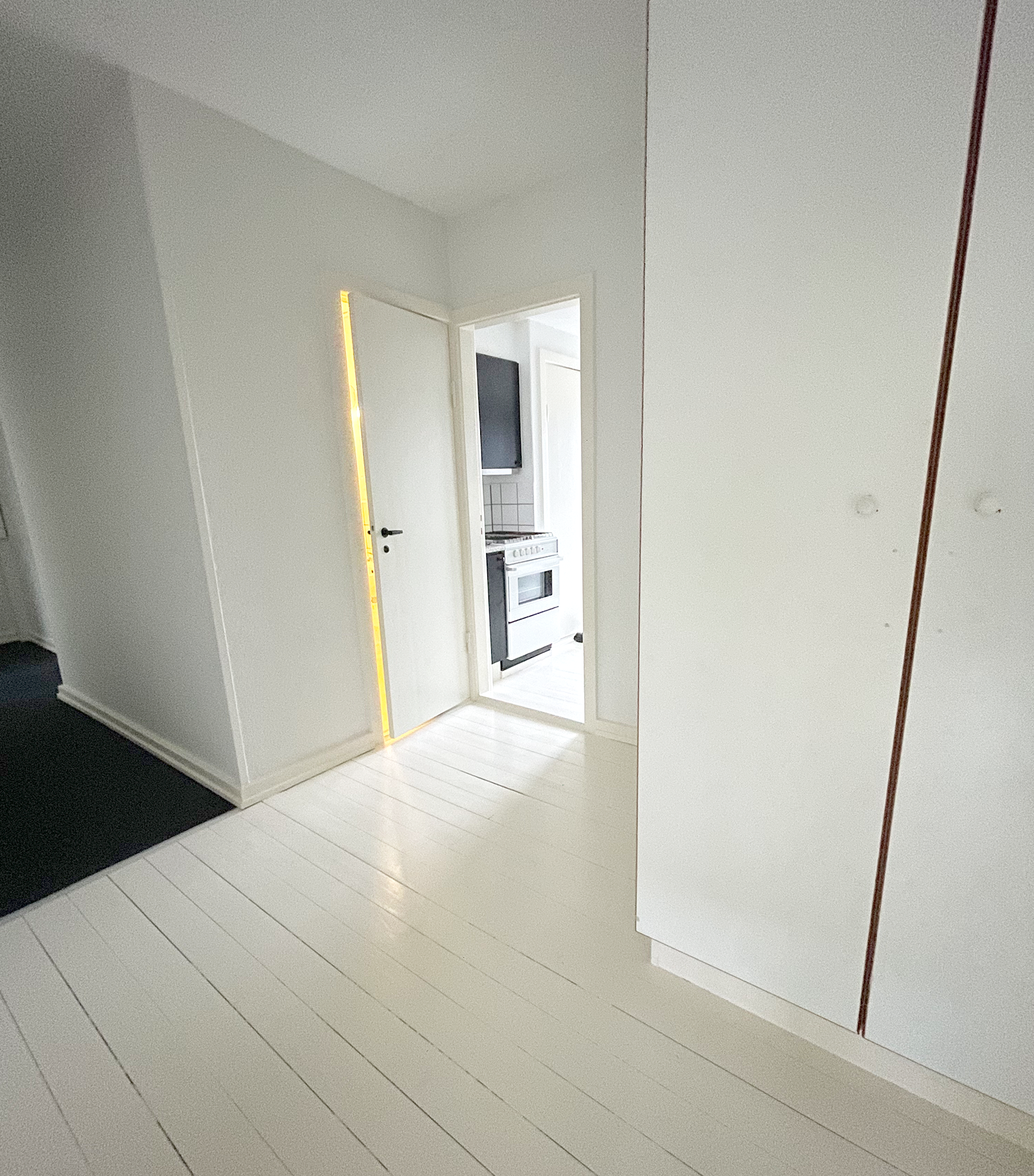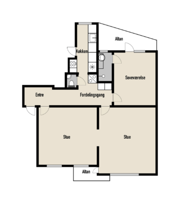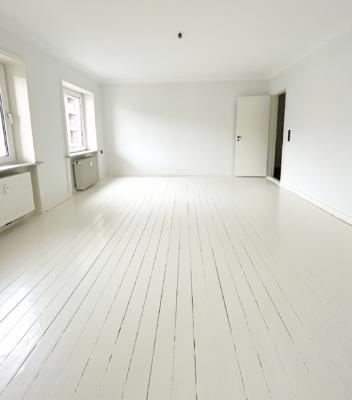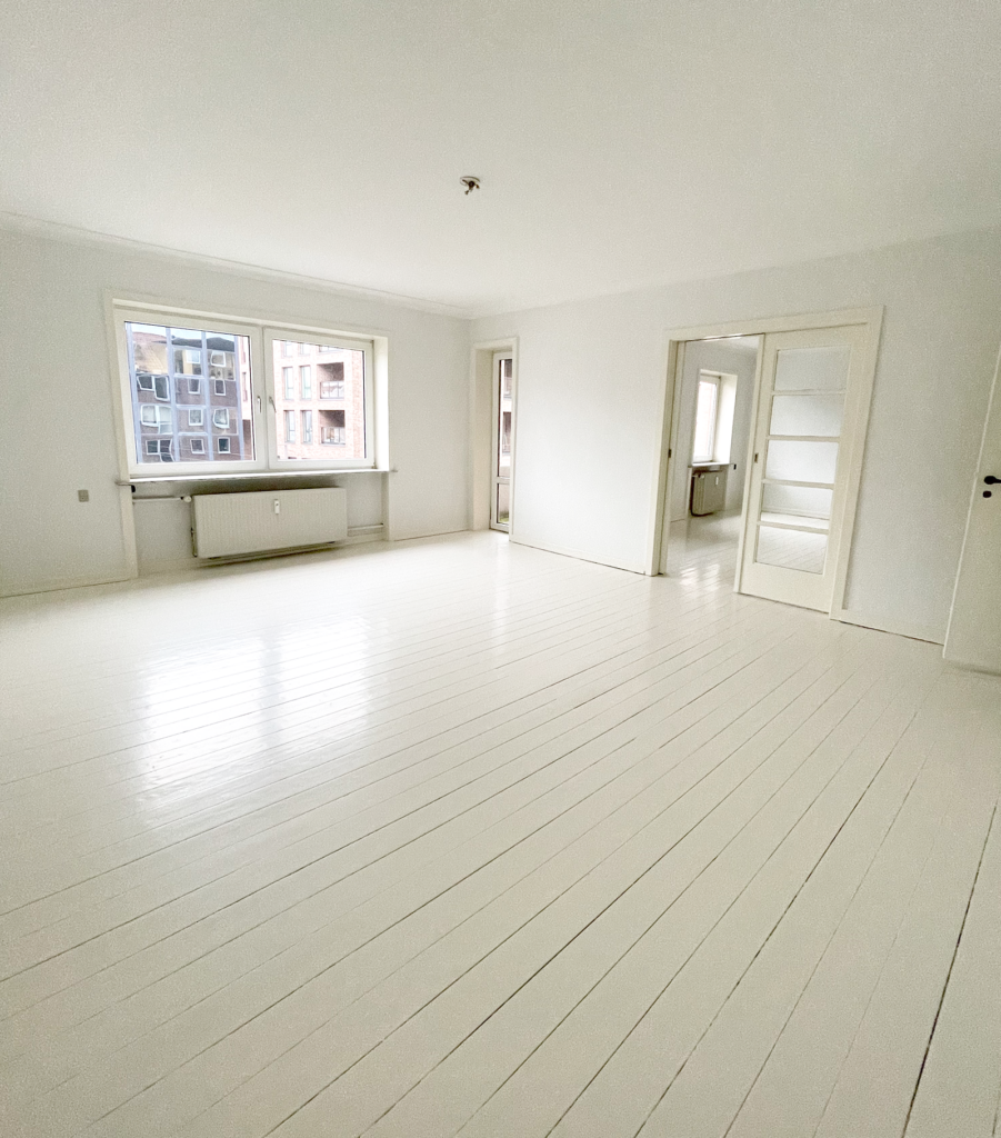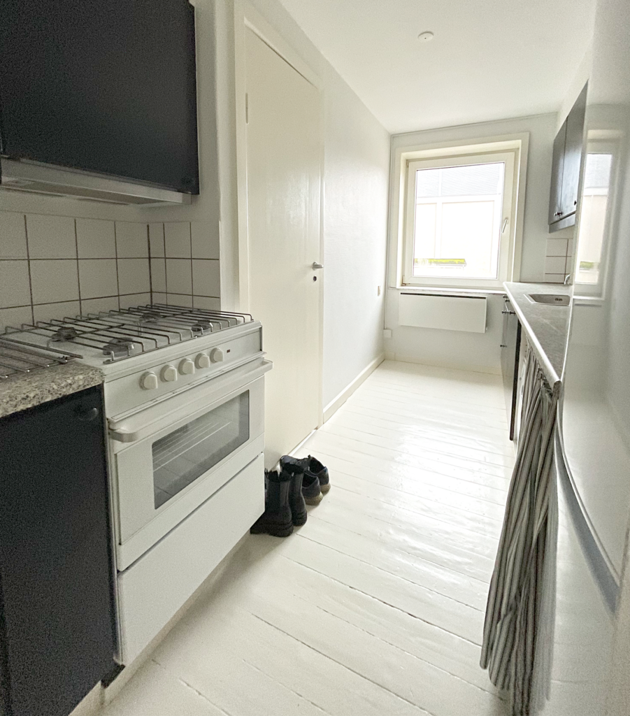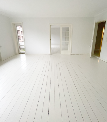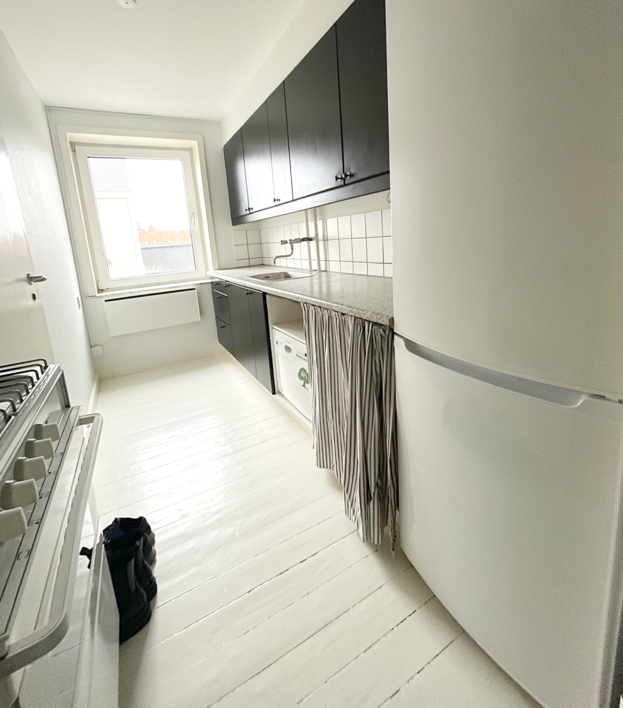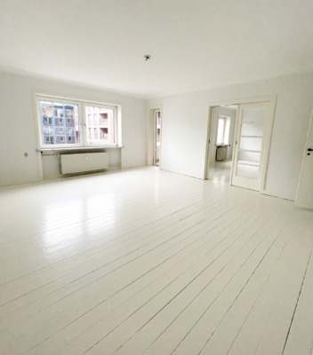 Selve lejligheden har to skønne altaner, en nordvendt og en sydvendt, hvor der på begge er plads til diverse havemøbler. Indendørs er der ældre charmerende trægulve, der er malet hvide, hvilket giver et lyst og indbydende indtryk. Lejligheden har en fordelingsgang, som samler alle rummene. Et fint køkken med god skabsplads, et toilet og et bad, to store stuer samt et soveværelse. Der er mulighed for installation af opvaskemaskine, tørretumbler og vaskemaskine.